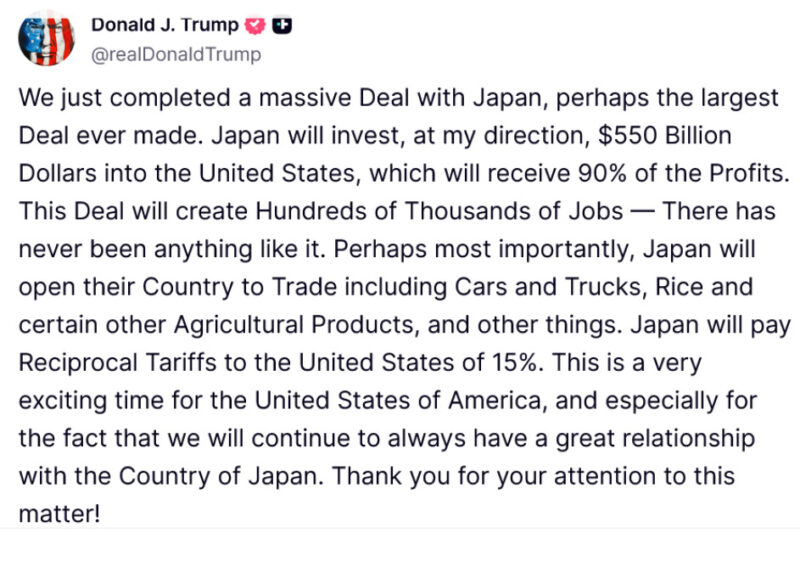 Американскиот претседател Доналд Трамп објави постигнување трговски договор со Јапонија, според кој, според него, Јапонија ќе инвестира 550 милијарди долари во Соединетите Држави и ќе плаќа реципрочна царина од 15 проценти.