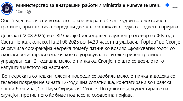 Денеска во СВР Скопје бил извршен службен разговор со Ф.Б. од село Света Петка, скопско. На 21.08.2025 во 14:30 часот на улицата „Васил Ѓорѓов“ во Скопје се случила сообраќајна несреќа помеѓу патничко возило „фолксваген голф“ со скопски регистарски ознаки, кое го управувал тој и електричен тротинет управуван од 13-годишна малолетничка од Скопје, по што со возилото го напуштил местото на настанот.